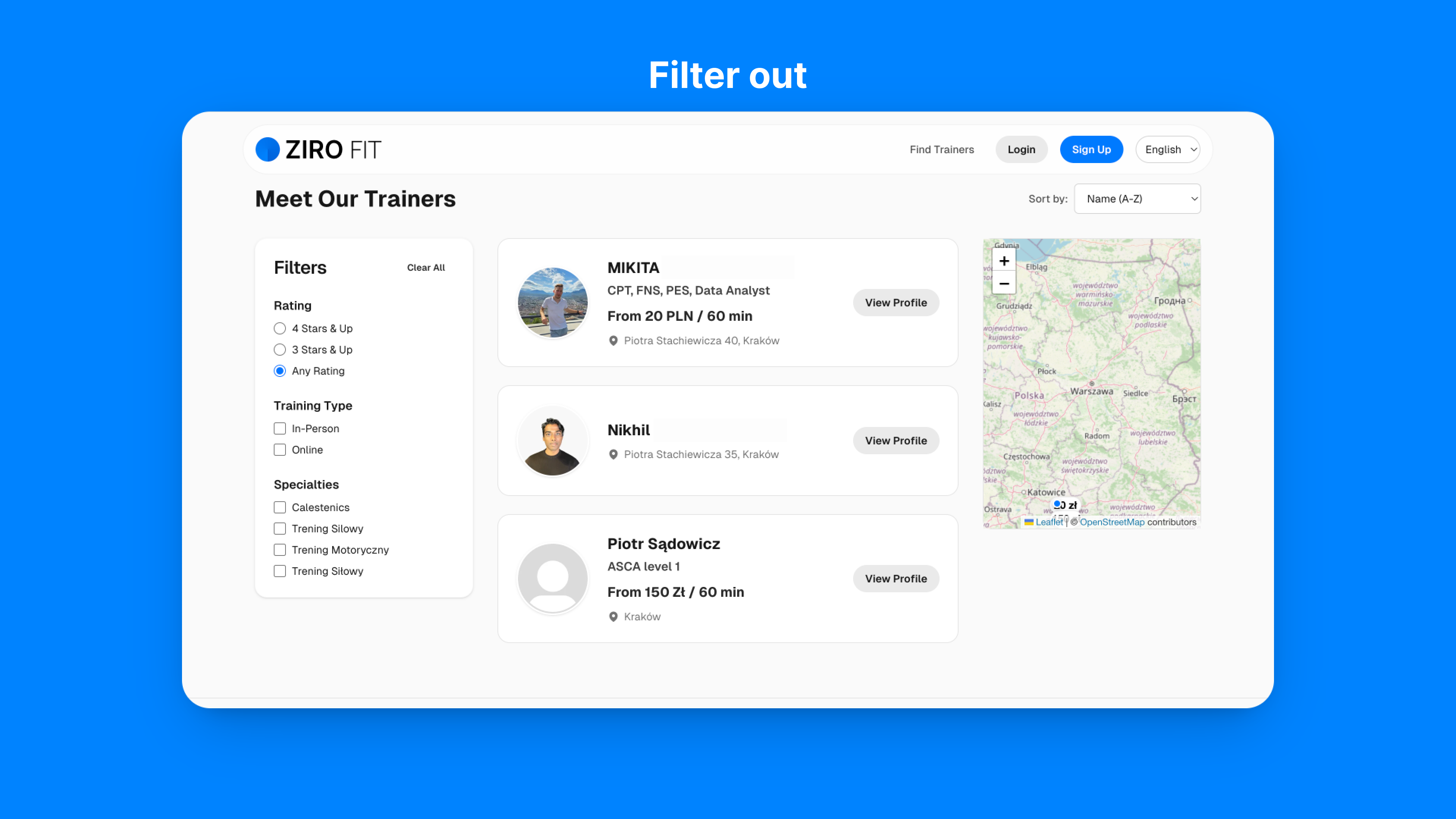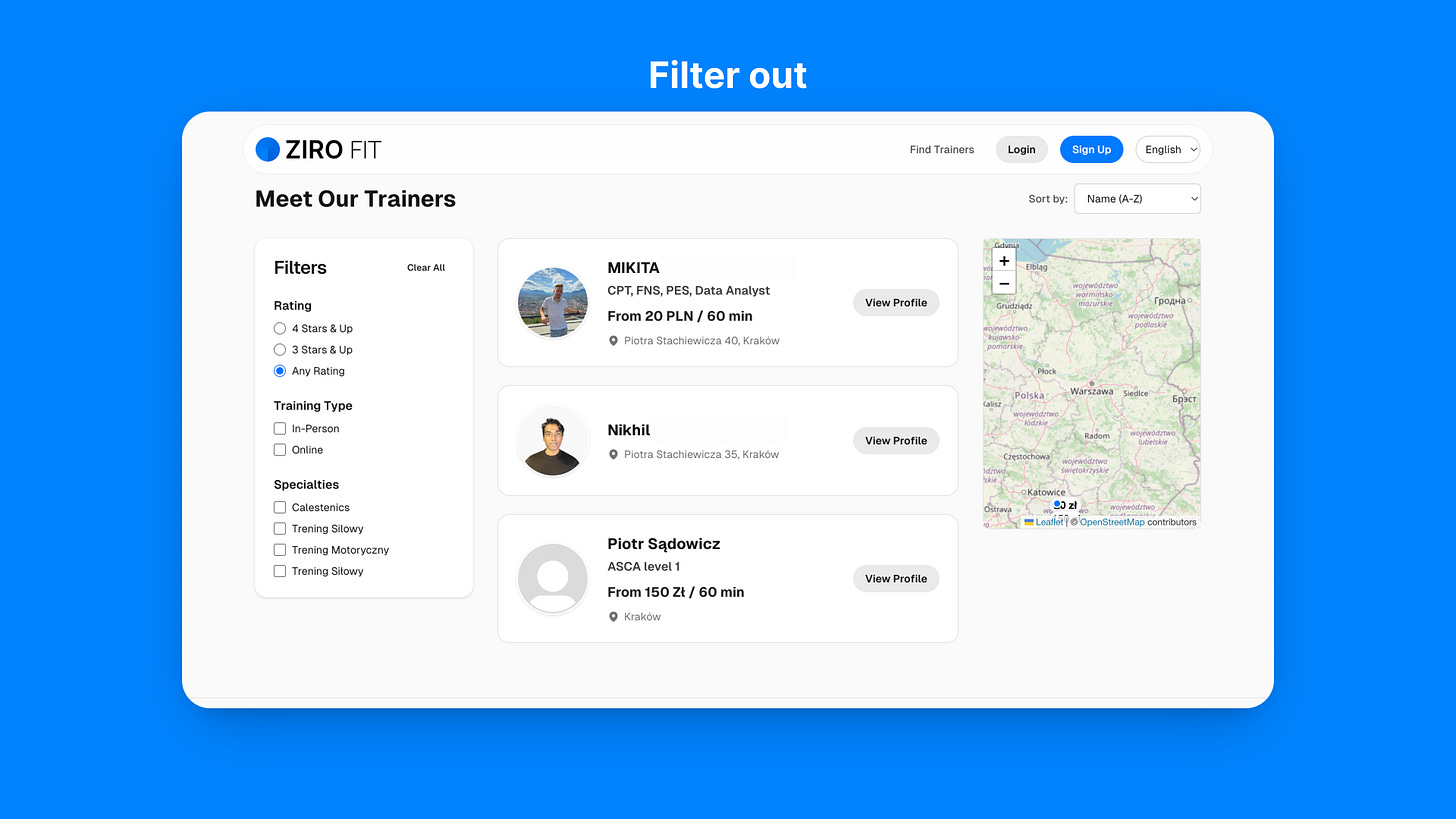Filter out trainers: Allowing clients to filter trainers by specific needs such as fitness goals, training styles, or credentials, ensuring better matches.